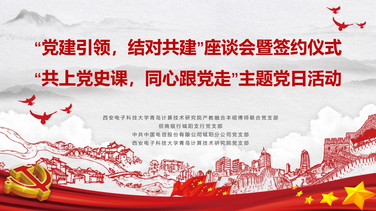 (通讯员 同榛)为认真学习贯彻习近平总书记在党史学习教育动员大会上的重要讲话精神,按照校院两级党史学习教育相关方案要求,best365手机版官方网站党委提前谋划,西电青岛计算技术研究院产教融合本硕博师联合党支部主动对接,与西电青岛计算技术研究院党支部、招商银行城阳支行党支部、中共中国电信股份有限公司城阳分公司党支部结对共建。best365手机版官方网站党委书记李青山、党委副书记张莹莹等一行5人赴西电青岛计算技术研究院参加了结对共建活动。
