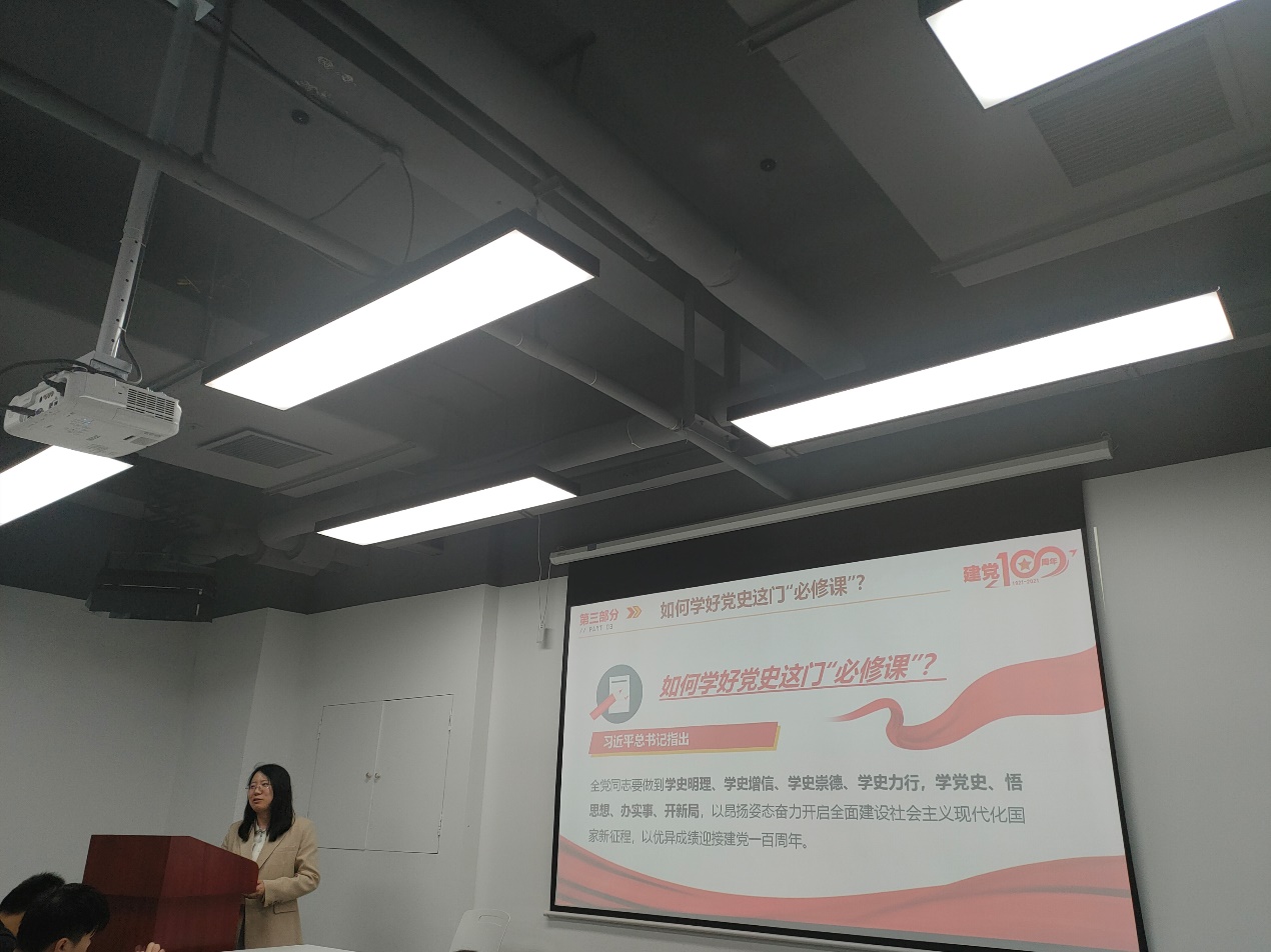 通过本次主题党日活动,支部的党员同志们对为何学、如何学党史有了更深的理解,引用习近平总书记的一句话,“全党同志要做到学史明理、学史增信、学史崇德、学史力行,学党史、悟思想、办实事、开新局”,作为新时代的新青年,要积极发挥主人翁的精神,严谨务实,脚踏实地,做好本职工作,以昂扬姿态奋力开启全面建设社会主义现代化国家新征程,以优异成绩迎接建党一百年。