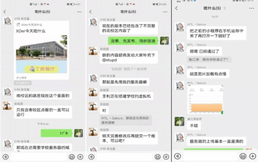 针对小程序运行之初,访问带宽受限、并行处理能力弱、小程序发布审核时间久等问题,best365手机版官方网站崔江涛教授、彭延国副教授带领研究生一起帮助张玉鉴加班加点提供解决方案,设计了支持高并发的部署方案,统筹协调计算中心开辟了专用虚拟服务器资源,争分夺秒完成了应用迁移,同时联系腾讯公司加速小程序审核,确保了“XDer今天吃什么”小程序及时发布。目前云选餐服务可以正常使用,后续将根据同学们的建议进一步完善相关功能。