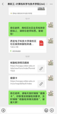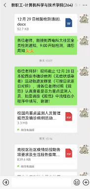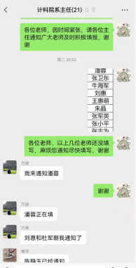 疫情来袭,高效准确地将相关信息及时传达至每一教职工显得至关重要。学院及时将学校防疫政策、核酸检测以及各类消息通过学院教职工大群和基层部门负责人两级传达至每一位教师,提醒广大教职工填写“健康卡”和“核酸检测情况摸排”。针对紧急的事情,相关基层负责人点对点逐一电话通知各基层单位老师,做好上传下达,齐心协力实现疫情防控“一个都不能少”。