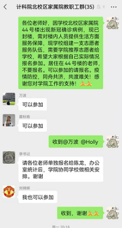 12月底,按照疫情防控办要求,北校区家属院全面严格执行小区封闭管理,落实人员“只进不出”要求,个别楼栋全面封闭,需要大量志愿者保障核酸检测等疫情防控措施顺利进行。学校北校区家属院44号楼出现新冠确诊病例封楼期间,学校组建一支志愿者服务队伍,对楼内人员提供生活方面服务保障,学院需要1名老师参加学校志愿者队伍,通知一发即有9位包括党政领导班子在内的老师积极报名,分别是刘锦辉,万波,霍秋艳,杜军朝,高悦,刘惠,王献青,李青山,张卫东。同时付少锋、黄伯虎、吴自力、杜军朝、张淑平、刘伟和霍秋艳等老师在南北校区积极参与社区防控工作。