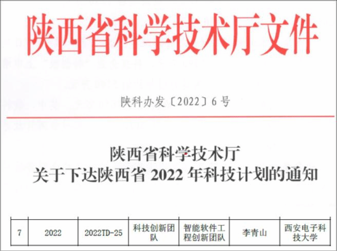 (通讯员 徐悦甡)近日,陕西省科技厅正式下发《陕西省科学技术厅关于下达陕西省2022年科技计划的通知》,其中公布了2022年陕西省科技创新团队计划名单,由best365手机版官方网站(国家特色化示范性软件学院)党委书记、软件工程学科负责人、西安市智能软件工程重点实验室主任李青山教授负责的智能软件工程创新团队成功入选。