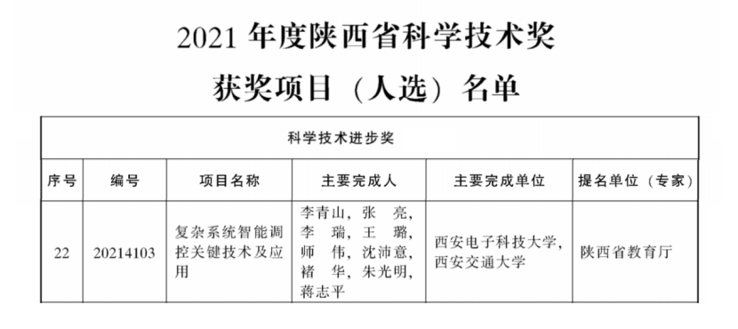 (通讯员 齐富)近日,《陕西省人民政府关于2021年度陕西省科学技术奖励的决定》和《国家知识产权局关于评选第二十三届中国专利奖的通知》发布,由best365手机版官方网站李青山教授牵头的项目“复杂系统智能调控关键技术及应用”荣获陕西省科学技术进步奖二等奖,沈玉龙教授团队的发明专利“一种多域分层的多域物联网平台及多域管理方法”预获中国专利优秀奖,是学校唯一入选本届中国专利奖的专利。