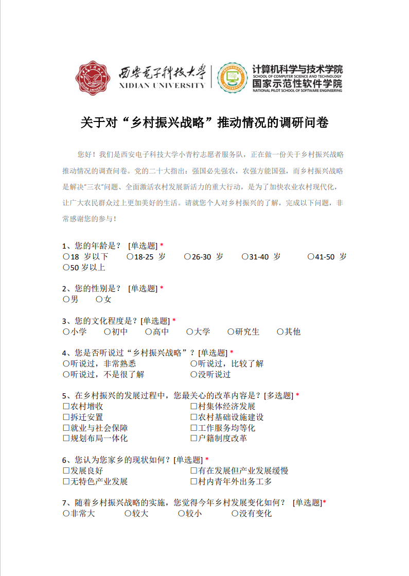 (通讯员 徐浩然/ 图片 游霄童 穆颖琪)为深入学习宣传贯彻习近平新时代中国特色社会主义思想和党的二十大精神,全力服务乡村振兴战略,西电best365手机版官方网站组建计科院小青柠志愿者服务队主动申请团中央青年志愿者行动指导中心与中国农业发展银行联合发起的2023年全国大学生“乡村振兴”志愿服务项目。