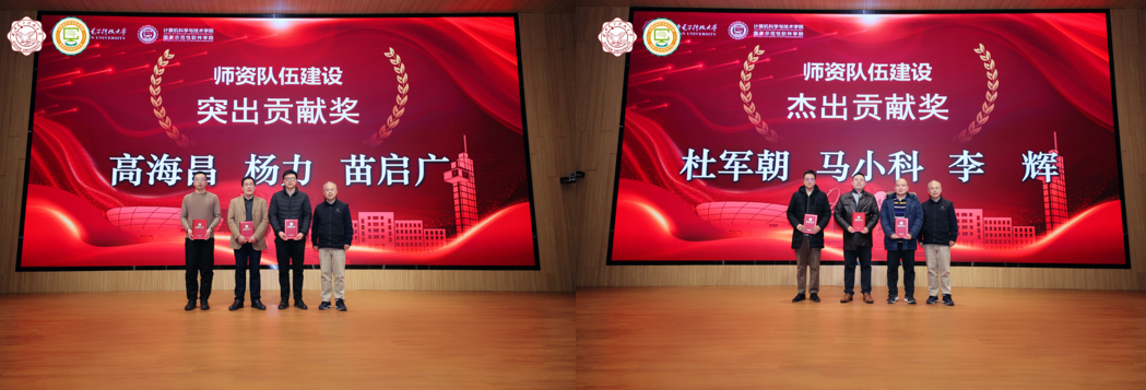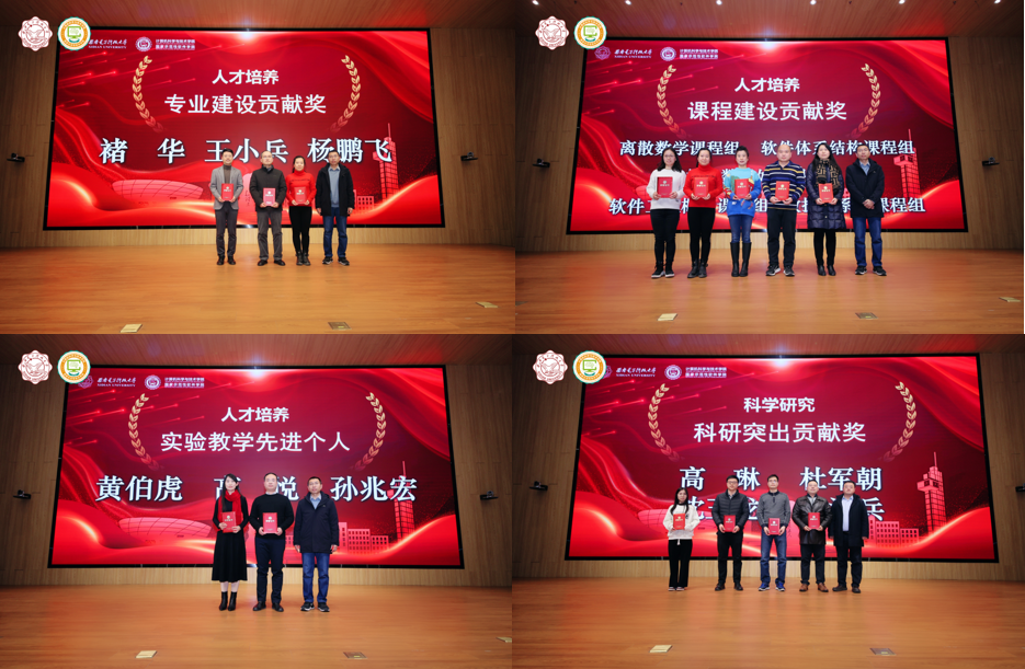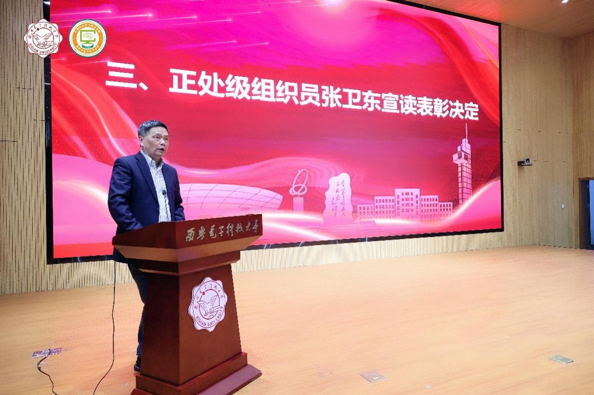 2023年度,在全体教职工的共同努力下,学院各项事业取得了重要成绩,涌现出了一批在党建、教学、科研、师资队伍建设、学生工作、管理服务、公共服务等方面的先进个人。学院正处级组织员张卫东宣读了学院表彰先进人员的决定。学院领导班子成员分别为获奖代表颁发荣誉证书并合影。
