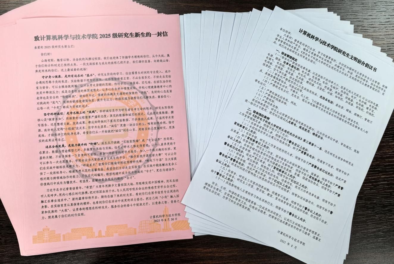 在用心打磨、精心制作后,学院为每位新生发放《致best365手机版官方网站2025级研究生新生的一封信》,字里行间既包含对新生加入计科大家庭的欢迎,更围绕“如何度过有价值的研究生时光”展开深度引导,为研究生阶段的学习、科研与生活筑牢根基;学院现场组织新生学习《best365手机版官方网站研究生文明宿舍倡议书》,志愿者通过案例教育、制度解读的方式,向新生重点强调宿舍用电安全、消防安全和卫生管理等方面的要求,让安全意识、文明意识从入学第一天便深植心间。