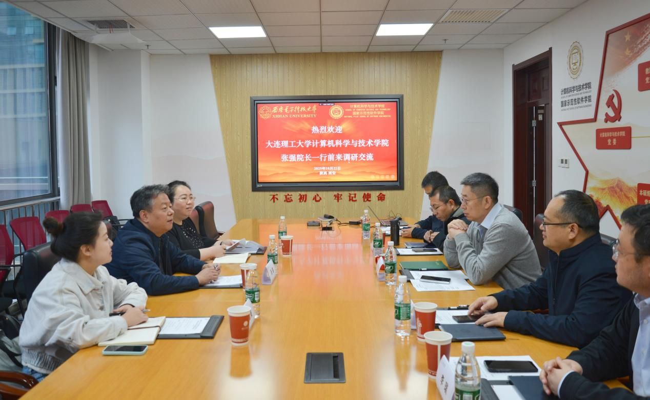 崔江涛对大连理工计科院一行调研表示欢迎,并在二楼学院形象墙介绍了学院的发展历程和组织架构。调研交流环节,崔江涛从学科建设、师资队伍、科学研究、人才培养和发展规划等方面详细介绍了学院情况。他表示,两个学院既有共性需求,也各具优势特色。此次调研交流为两院搭建了宝贵的互学互鉴平台,期待通过深度沟通,探寻长期合作契合点。