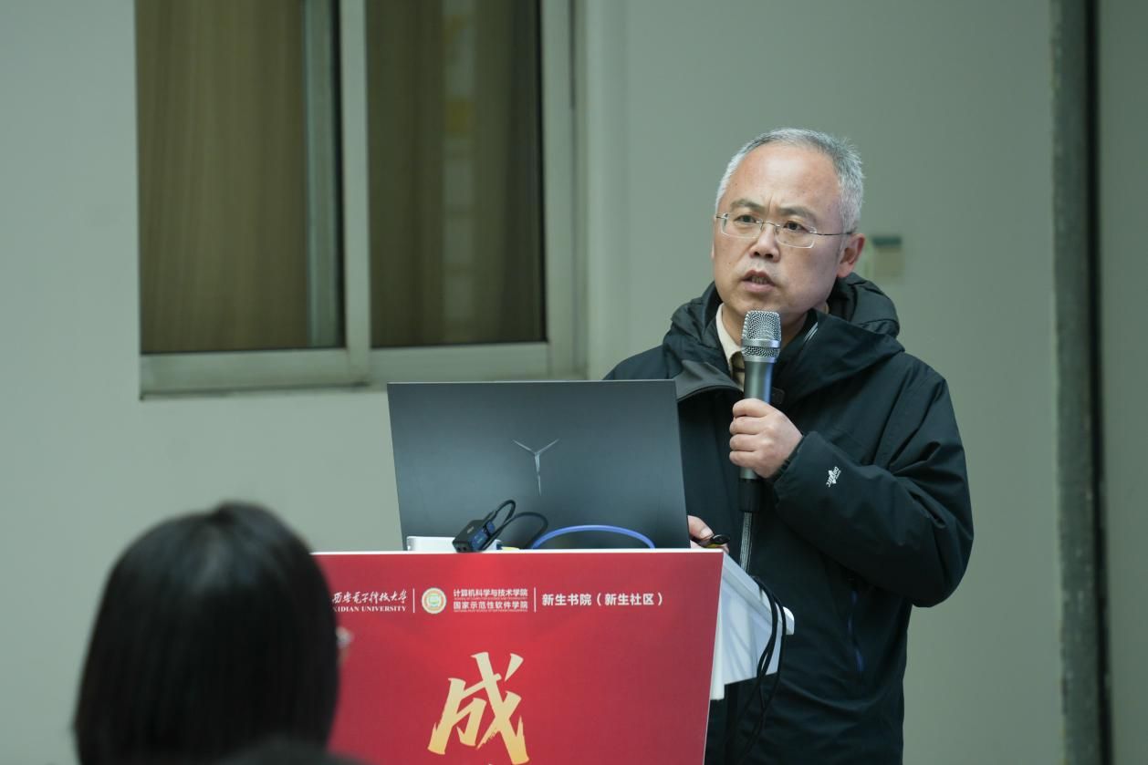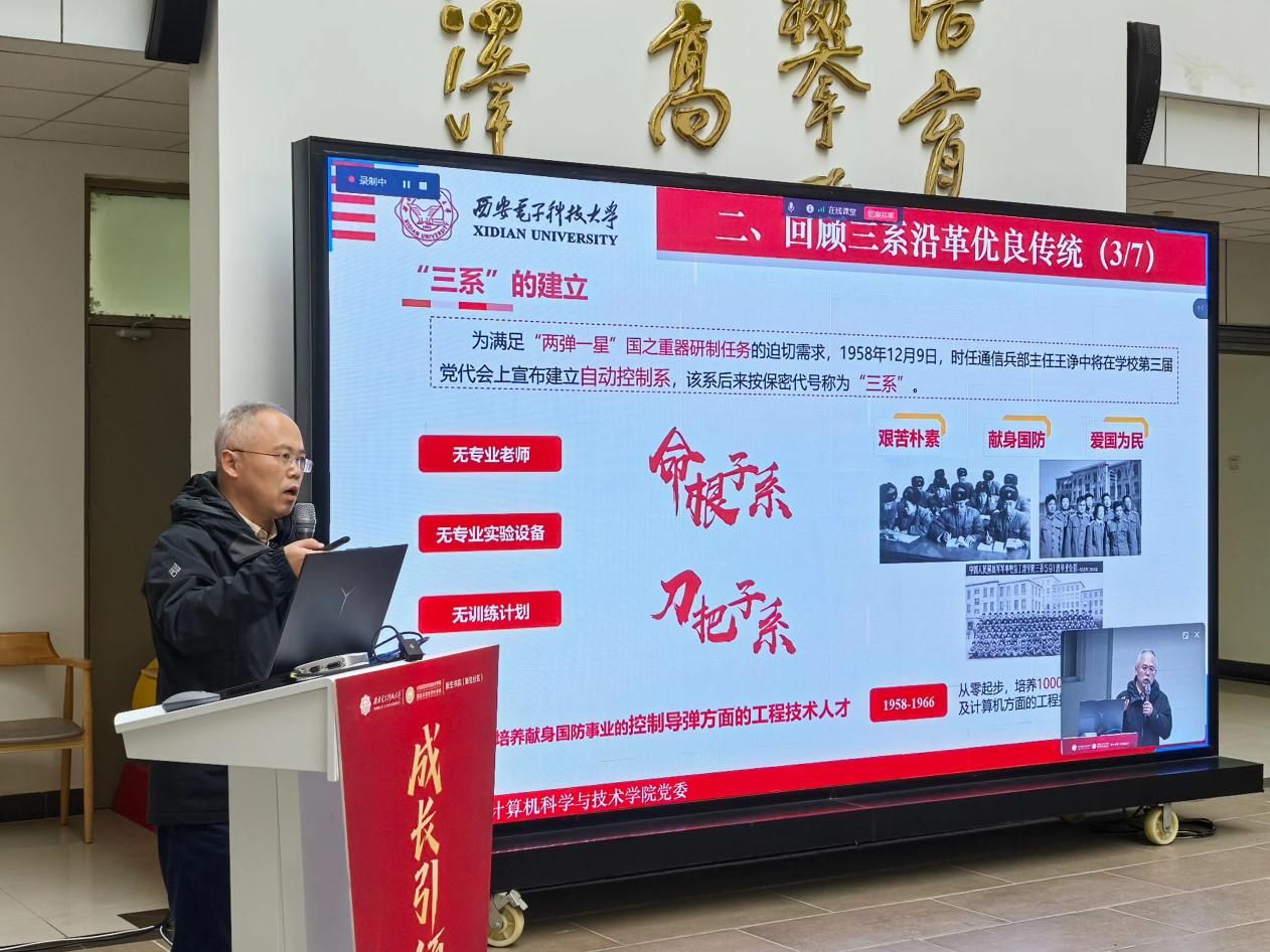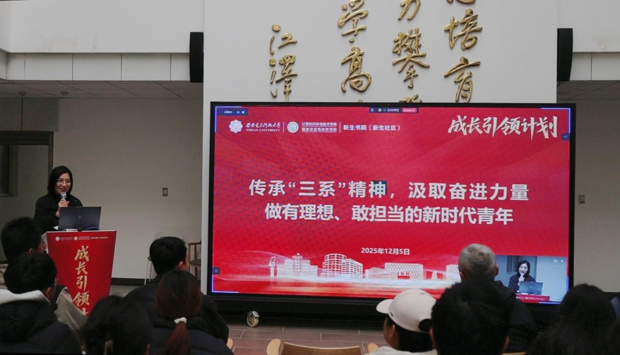 (通讯员 黄彩红)12月5日下午,best365手机版官方网站“成长引领计划”系列活动之“三系”精神思政大课暨新生书院中级党校党课顺利举行。学院党委书记李青山教授以《传承“三系”精神,汲取奋进力量,做有理想、敢担当的新时代青年》为题,为2025级计算机大类新生带来了一场深刻而生动的院史院情教育课。为深化双院协同育人,计科院采取线上线下相结合的形式进书院开展大课,学院新生入党积极分子集中海棠5号楼二楼大厅现场参与,数据科学与大数据技术中英班学生在A-527分会场观看,其余同学通过“学在西电”平台观看直播的方式同步学习。计科院分管学生工作的负责同志、计算机类辅导员、新生书院办公室相关同志和六百余名计算机类新生参与活动,新生书院(新生社区)副书记王朱丹主持本次大课。