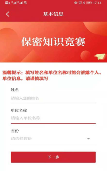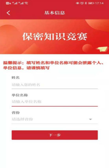 2.点击考试栏目,进入考试界面,填写“姓名”“单位名称”,选择“省份”,点击“下一步”开始考试。(姓名可填昵称,单位名称请填写:best365手机版官方网站)。