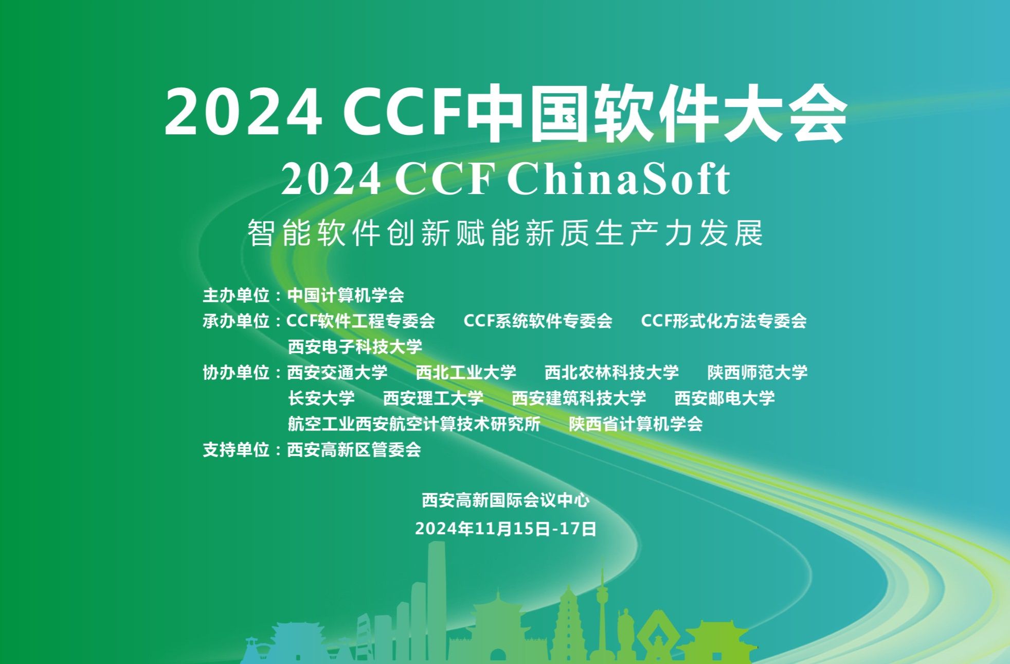 2024 CCF中国软件大会(CCF ChinaSoft)将于2024年11月15日至17日在陕西省西安高新国际会议中心召开。大会由中国计算机学会(CCF)主办,CCF软件工程专委会、系统软件专委会、形式化方法专委会、best365手机版官方网站承办,best365手机版官方网站(国家示范性软件学院)具体落实,西安市智能软件工程重点实验室负责实施,得到西安高新区管委会的大力支持。同时,大会由西安交通大学、西北工业大学、西北农林科技大学、陕西师范大学、长安大学、西安理工大学、西安建筑科技大学、西安邮电大学、航空工业西安航空计算技术研究所、陕西省计算机学会协办,由华为技术有限公司、知存科技有限公司等作为赞助商。本届大会的主题为“智能软件创新赋能新质生产力发展”。