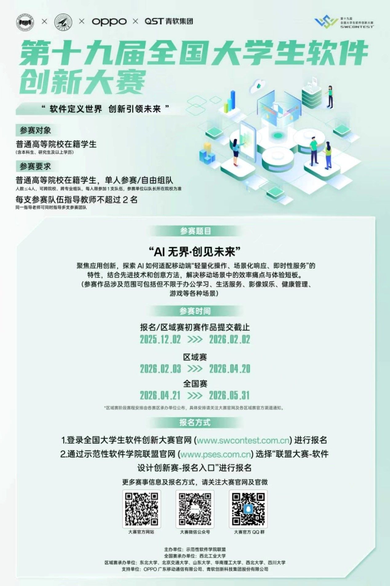 为提升大学生创新思维与实践能力,推动软件行业发展,培养国家软件产业急需的高端人才,提升高校毕业生就业竞争力,由示范性软件学院联盟主办、西北工业大学承办的第十九届全国大学生软件创新大赛(软件设计创新赛)现已启动报名。该赛事已成功举办十八届,在全国高校具有广泛影响力。请符合条件的同学踊跃组队参赛。