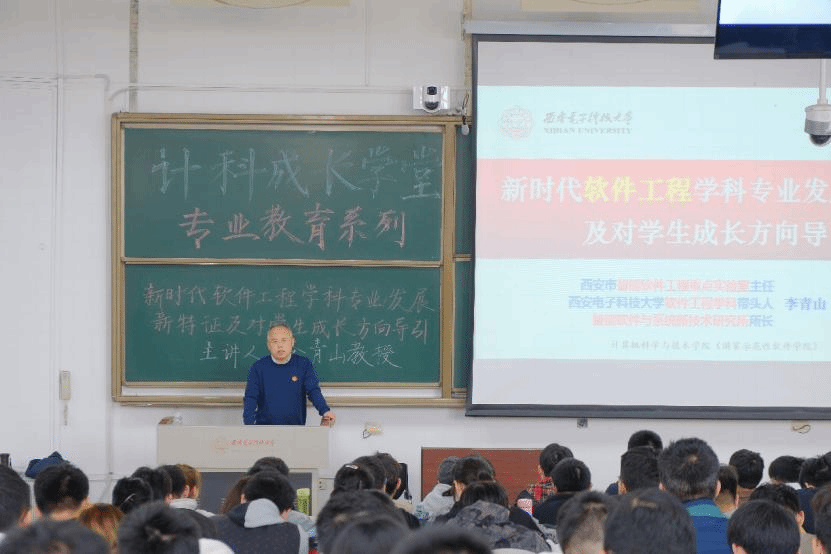 李教授着重介绍了学院软件工程专业的建设情况。他阐明软件工程学科内涵,指出软件工程学科的历史使命在于基于国家示范性软件学院、软件工程一级学科培养应用型软件工程技术人才;其时代使命在于依托特色化示范性软件学院,在自主可控国产软件领域培养特色化软件人才。李教授介绍了学院软件工程学科和专业的历史沿革,分析了学院软件工程学科和专业的基础状态,列举了学院近五年的学科建设成效以及学科建设举措,并向现场的同学们讲解了软件工程学科的培养体系,介绍了学院软件工程专业学科建设的新举措。他指出,学院软件工程学科致力于传承西电红色基因,建设特色化示范性软件学院,服务国家软件产业发展战略,力争在通用领域、国防军工上有所作为;要打造产教结合、本硕贯通的西电特色软件工程学科培养体系,为祖国培养德才兼备、又红又专的社会主义事业的合格建设者和可靠接班人。