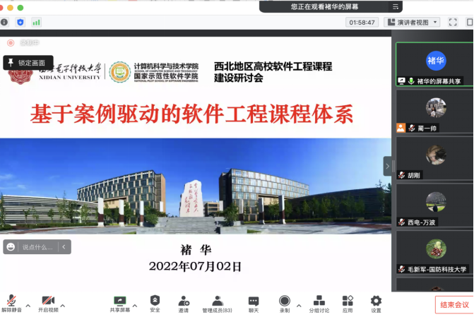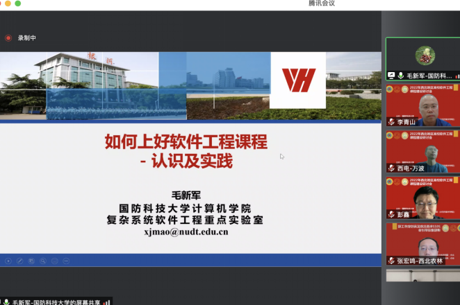 本次西北地区高校软件工程课程建设研讨会(以下简称研讨会),由国防科技大学主办,best365手机版官方网站(示范性软件学院)承办,研讨会邀请了国防科技大学、复旦大学、best365手机版官方网站、西安交通大学、西北工业大学、西北农林科技大学、陕西师范大学、西安科技大学、兰州大学、宁夏大学、青海师范大学、新疆大学、内蒙古大学等西北地区高校,通过特邀报告、交流沙龙等形式,交流软件工程课程教学和教改的成果,分享软件工程课程教学资源,商讨软件工程课程教学中遇到的各类困难和问题,提升软件工程课程建设水平。研讨会吸引了国内外软件工程相关领域教师的广泛参与。研讨会采用线上形式举行,腾讯会议室同时在线人数超过80人。