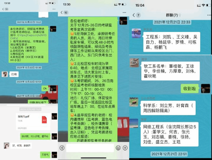 一、攻坚克难,顺利完成研究生招生考试任务。12月23日西安市疫情防控升级,对学校研究生招生考试工作带来了严峻挑战。学院高度重视研究生考试的考务组织工作,坚决落实“应考尽考”原则,迅速安排办公室管理人员点对点联系学院选派的70多名承担研究生招生考试考务工作的老师,精准摸排老师们的健康状况、住宿位置和疫情防控要求,主动为其办理出入小区的工作证明、发放考务工作牌及做好考务工作流程提醒,确保学院考务工作人员正常到位。按照组织部疫情防控工作要求,接到通知2小时内召集30多名教师迅速组建了疫情防控志愿服务队,参与到学校研究生招生考试的考务和疫情防控工作,全力保证学校研招考试工作顺利完成。