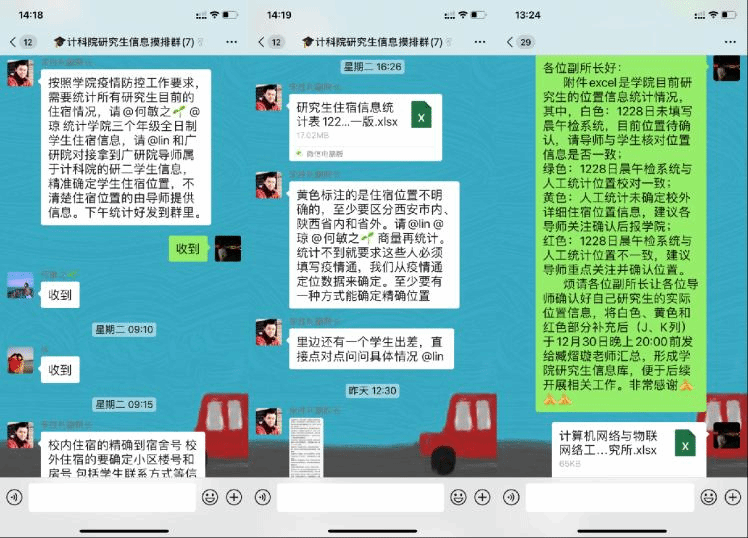 四、精准摸排,全面掌握学院研究生状态信息。按照学院疫情防控工作要求,学院办公室管理人员、研究生辅导员密切协同,迅速采集学院1500余名研究生的状态信息,通过与疫情通和晨午检系统交叉校验,精准掌握每位学生的状态和位置信息,协助导师做好学生的关心关爱和指导工作。同时,学院要求导师切实承担起研究生第一责任人的角色,严格按照学校和研究生院的各项工作要求,实时掌握所指导研究生的学习和科研工作状态,了解每位研究生的科研进展、生活、心理和就业等情况,采取多种形式对研究生开展学习和科研指导,做到至少每2天联系沟通1次,发现问题及时反馈至各研究所和学院,上下联动,共同解决研究生遇到的各种实际困难,为疫情防控期间做好研究生培养工作提供全方位综合保障。