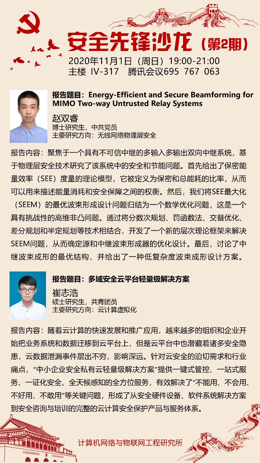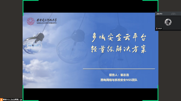 来自计算机网络与物联网工程研究所本硕博师第一联合党支部的博士研究生赵双睿同学,以保密能量效率为主题,具体介绍了一种低复杂度波束成形设计方案。硕士研究生崔志浩同学以云计算的概念为切入点,介绍了云安全典的迫切需求和行业痛点,介绍了研究所保护云计算安全的完整产品体系和研究所已取得的一些成就等。在问答环节,线上线下的听众积极提问,与报告人开展了积极有效的互动交流。