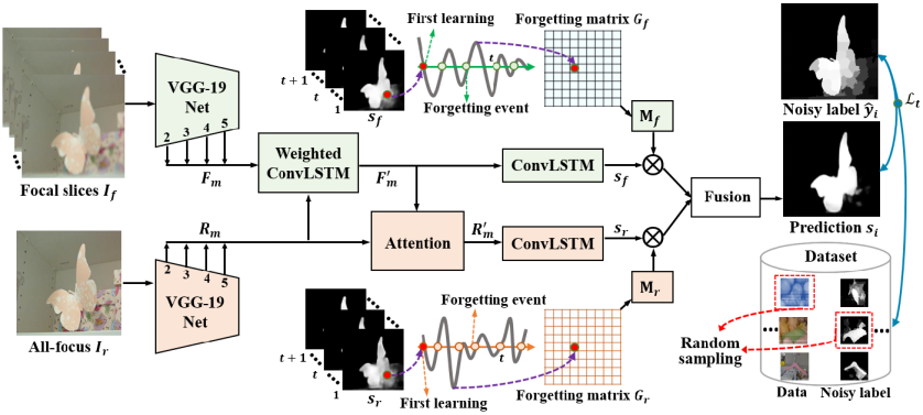 冯明涛博士长期从事复杂场景视觉感知与理解领域相关的研究工作,在学院良好科研环境支持下,所做系列工作相继发表在IEEE TIP、PR、ICCV等期刊会议,并入选2021年青年托举人才,是论文“基于像素级噪声标签的学习策略:一个光场显著性检测的新视角”(“Learning from Pixel-Level Noisy Label : A New Perspective for Light Field Saliency Detection”)的第一作者,张亮教授是该论文的通讯作者,合作者有湖南大学王耀南教授、澳大利亚西澳大学Ajmal Mian教授等,best365手机版官方网站是该论文的第一完成单位及通讯作者单位。该论文受人类学习过程中“学习-遗忘-再学习”的机制所启发,解析了不确定标签监督下深度网络模型训练过程中的遗忘规律,抑制不确定标签对深度网络模型训练的干扰,进而大幅度提升深度网络模型的鲁棒性和稳定性。