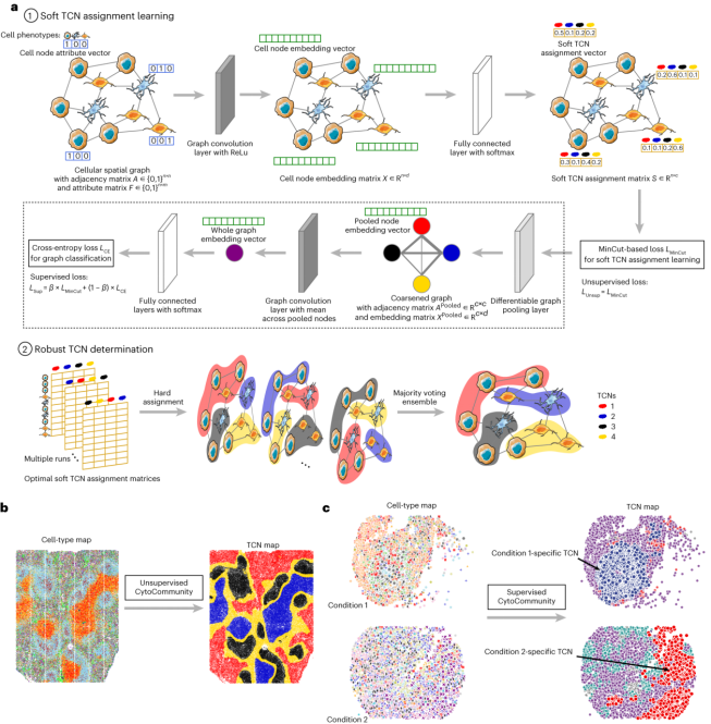 本研究提出了CytoCommunity算法(即“细胞社团”识别算法),是第一个能对单细胞空间图谱同时进行无监督和有监督学习来识别TCN的计算工具,能够在可变空间尺度上发现条件特异性的细胞邻域协作模式,为解析肿瘤-免疫互作机制提供分析工具。CytoCommunity优势体现在:(1)使用细胞表型作为特征学习TCN的划分,有助于TCN功能解释;(2)仅使用GNN模型进行TCN的学习,不需要聚类作为中间步骤;(3)不仅可以识别单个组织样本中的TCN(无监督模式),还可以从带标签的组织样本队列中识别条件特异性TCN(监督模式),这是解决样本间图对齐难题的有效策略。值得一提的是,CytoCommunity算法思想所衍生出的一个有趣的机器学习问题是:如何建立图分类问题和图聚类问题的关联性。另外,本成果得到国家自然科学基金重点项目、青年项目,陕西省高校科协青年人才托举计划项目,以及西电基础研究跃升计划优青培育项目等的资助。原文链接:https://www.nature.com/articles/s41592-023-02124-2