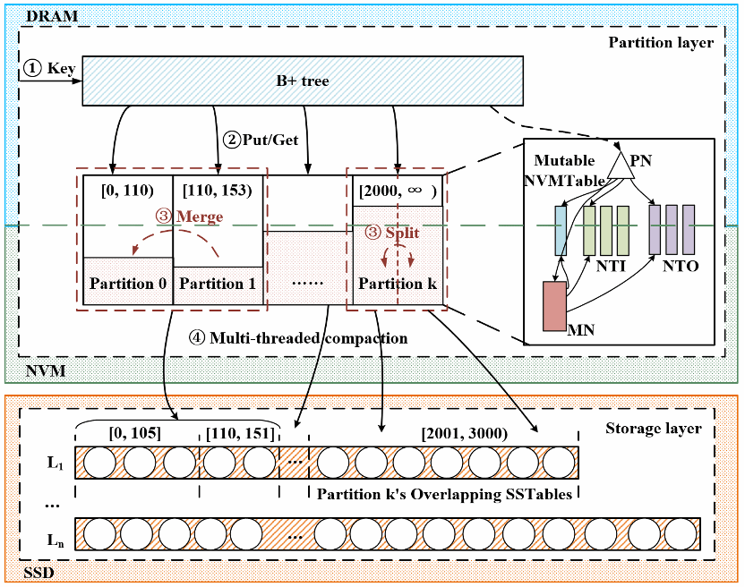 索引结构是数据库内核关键支撑技术,LSM-tree凭借其追加写和延迟合并机制,具备优异的写入性能,已成为主流键值存储系统的核心索引结构。论文PartitionKV: Redesigning LSM-tree KV Stores on NVMs with Adaptive Partitioning for Reducing Write Stalls and Amplification提出了一种基于自适应分区策略的DRAM-NVM-SSD三层混合架构键值存储系统PartitionKV。该系统利用NVM接近DRAM的读写速度、非易失性以及字节寻址能力,构建位于DRAM和NVM上的有序分区层来替代SSD上无序的L0层,能够避免所有L0和L1数据参与合并,从而显著降低写放大与写停顿,提升随机写性能。实验结果表明,相较于现有系统,PartitionKV将平均随机写延迟和写放大分别降低了 48.5% 和 22.2%。论文第一作者为硕士研究生黄兴业,夏小芳副教授、崔江涛教授为共同通讯作者。
