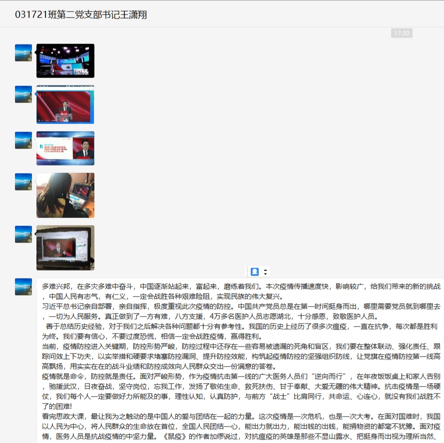 本科17级计算机科学与技术专业0108班班长史越超通过腾讯课堂组织了主题班会,全班62名同学在线上的“云”相聚,共同观看思政课。在班长的组织下,同学们结合课程学习内容对党中央关于疫情防控的决策部署、身边防疫抗疫一线的感人故事等展开了讨论。班长史越超表示:“通过本次班会学习,同学们明确了作为大学生在这场疫情中的责任与担当,表示要身体力行,积极参与到防疫抗疫中,相信在不久后我们一定能取得战斗的胜利!”