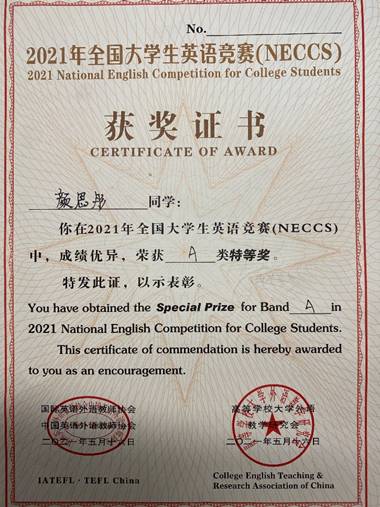 (通讯员 何敏之)5月16日,经过激烈的角逐,在2021年全国大学生英语竞赛(NECCS)陕西赛区复赛中,best365手机版官方网站2020级硕士研究生颜思彤脱颖而出,斩获A类特等奖,她也是全校唯一在复赛中取得A类特等奖的研究生。此外,全校共有九位同学获得该竞赛陕西赛区特等奖的优异成绩。