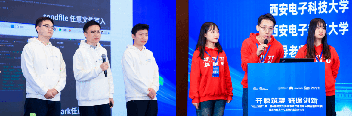 大赛吸引了107所研究生培养单位的277支队伍踊跃报名参赛,最终有83支队伍晋级全国总决赛,其中我校队伍6支,在晋级全国高校中排名并列第3。大赛分4个赛道进行,分别是OpenHarmony开源社区赛事、OpenEuler开源社区赛事、OpenKylin开源社区赛事以及OpenAnolis开源社区赛事。23日大赛开幕后,我校6支队伍参与了分组答辩,其中我校best365手机版官方网站NSS攻击组、一斤鸭梨队脱颖而出,与国防科技大学、上海交通大学、南京大学、华东师范大学等8支一等奖队伍共同进行公开路演与答辩,近30位业内专家严格评审,智慧与技术交锋,角逐冠亚季军殊荣。最终,我校NSS攻击组获全国亚军。本次也是我校首次参赛即获一等奖两项(含全国亚军一项)、二等奖一项、三等奖三项,一等奖数量并列全国第一的好成绩。