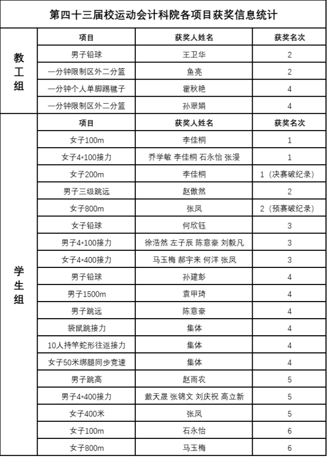 为期两天的赛程中,计科师生奋勇拼搏、突破自我,多个项目均有亮眼表现。其中,2020级计算机科学与技术专业本科生李佳桐和张凤分别打破学生组女子200米和女子800米校运会记录。教工组也不甘落后,王卫华荣获教工组男子中年乙组铅球比赛第2名,霍秋艳在一分钟个人单脚踢毽子项目中取得第4名,在教工女子组一分钟限制区外投二分篮项目中鱼亮和孙翠娟也分别取得第2名和第4名的好成绩。最终,计科院学生组以103分获得团体总分第四名。