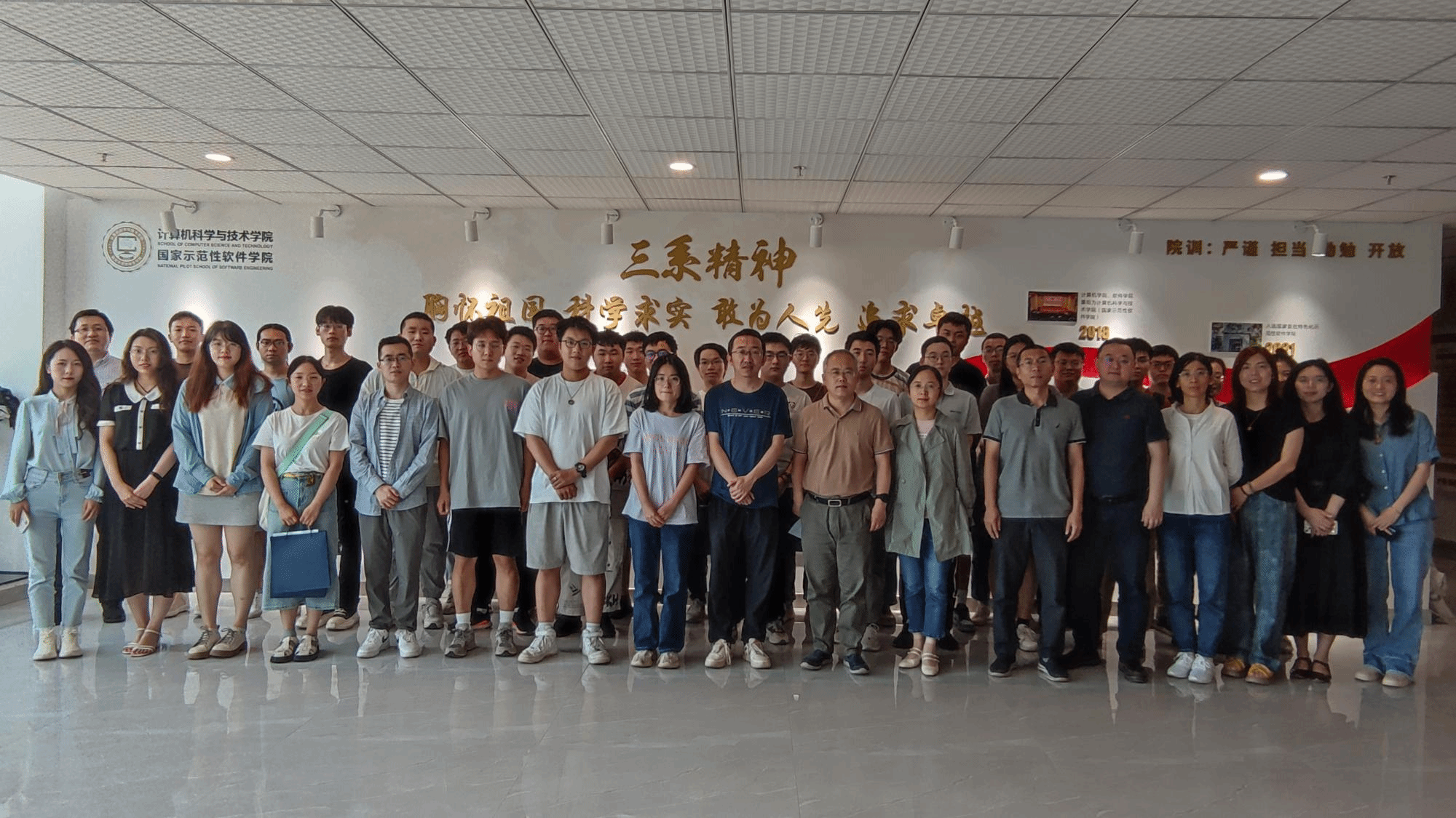 会后,与会师生在“三系精神”学院文化墙前共同合影留念。