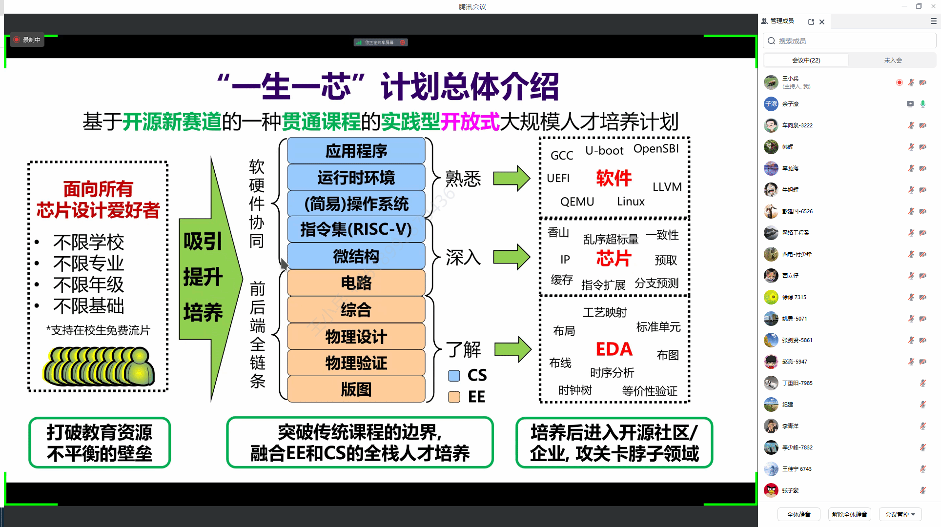为了更好的实施“一生一系统”计划,12月4日下午,计算机拔尖班负责人王小兵教授主持的“一生一芯”教学经验分享会在线举行,计算机组织、操作系统相关课程组授课教师、实验教师,感兴趣的教师参加。
