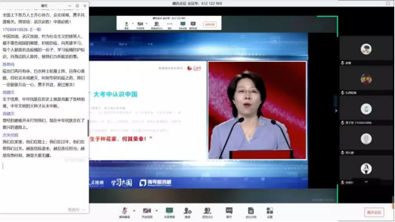 本科2017级计算机科学与技术专业17030108班班长史越超通过腾讯课堂组织了主题班会,全班62名同学在线上的“云”相聚,共同观看思政课。在班长的组织下,同学们结合课程学习内容对党中央关于疫情防控的决策部署、身边防疫抗疫一线的感人故事等展开了讨论。班长史越超表示:“通过本次班会学习,同学们明确了作为大学生在这场疫情中的责任与担当,表示要身体力行,积极参与到防疫抗疫中,相信在不久后我们一定能取得战斗的胜利!”