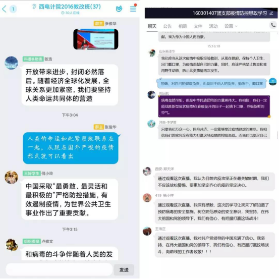 本科2017级软件工程专业同学们使用QQ群课堂一起观看直播。课堂期间,辅导员李栋与同学们进行讨论交流,大家积极在评论区进行留言交流,表达了对战胜疫情的信心。直播结束后,同学们以宿舍为单位分别进行了线上小组讨论。武汉籍同学宗永承表示:“我们国家在面对这次疫情时,及时的应对值得其他抗击疫情的国家借鉴,中国一定会好起来的!”