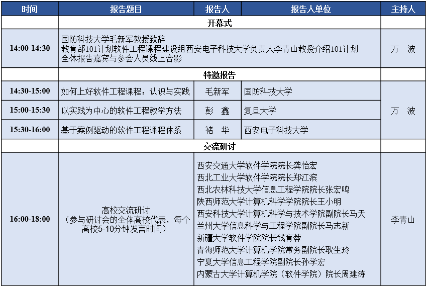 本次西北地区高校软件工程课程建设研讨会,邀请国防科技大学、复旦大学、best365手机版官方网站、西安交通大学、西北工业大学、西北农林科技大学、陕西师范大学、西安科技大学、兰州大学、宁夏大学、青海师范大学、新疆大学、内蒙古大学等西北地区高校,通过特邀报告、交流沙龙等形式,交流软件工程课程教学和教改的成果,分享软件工程课程教学资源,商讨软件工程课程教学中遇到的各类困难和问题,提升软件工程课程建设水平。