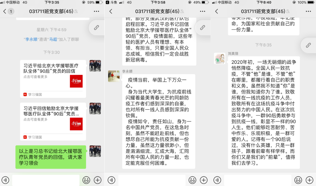 3月15日,习近平总书记给北京大学援鄂医疗队全体“90后”党员回信,向他们和奋斗在疫情防控各条战线上的广大青年,致以诚挚的问候。回信在广大青年学生,特别是党员中引起热烈反响。3月18日下午,best365手机版官方网站硕士031711班第一、二党支部举办了线上主题党日活动,围绕“学习习近平总书记回信精神,绽放青春绚丽之花”主题,认真学习回信精神,展开热烈讨论。