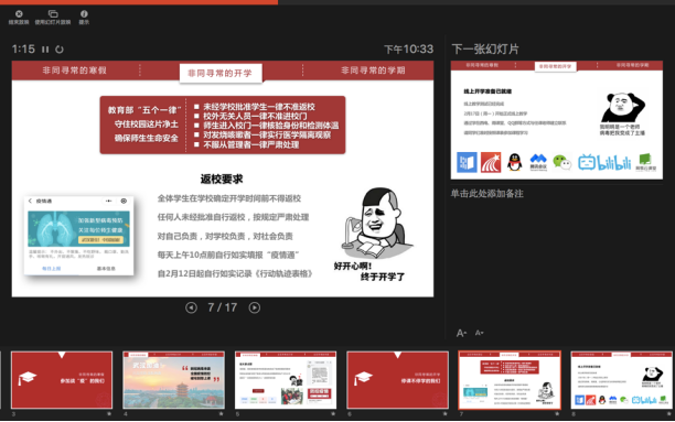 当晚,best365手机版官方网站各年级分别通过不同平台,同时组织了线上“晚点名”,开展抗“疫”教育与开学动员教育工作。本科2016级辅导员艾菲、郭禹宏老师、2017级辅导员李栋老师通过“雨课堂”、腾讯群视频等进行了直播。通过主题班会,计科院各年级落实落细接下来的防控任务,组织班级骨干、学生党员主动担当,形成网格化管理服务体系;就同学们在家配合做好防控工作、参加在线学习提出具体要求,特别是应对新学期的新任务做好准备。本科2016级是毕业年级,辅导员老师在班会上叮嘱同学们充分利用好大学最后一个学期的时间,“顺利完成本科学业,明确个人发展方向,努力争取深造或就业机会,寻找适合自己的工作”。