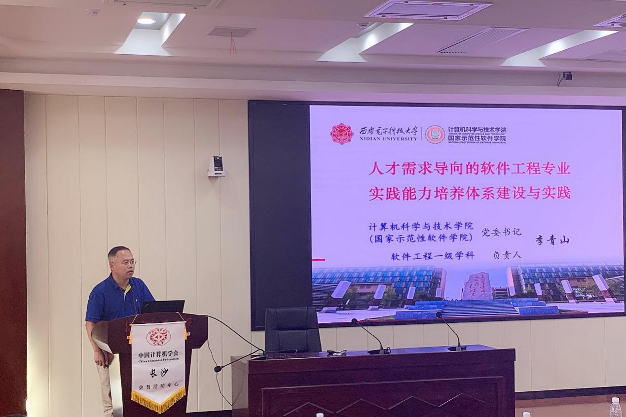 本次研讨会主题报告环节,CCF软件工程专委会主任、南京大学李宣东教授,CCF软件工程专委会常务委员、中国科学院大学魏峻教授、武汉大学应时教授、国防科技大学毛新军教授等专家学者分别就新形式下软件工程人才实践能力培养及教学实践分享了最新的研究成果和实践经验,军事科学院、华为、百度和微众银行等企事业单位技术专家从软件工程技术人才需求角度分析了当前面临的挑战。李青山教授围绕应用型软件工程人才培养目标,结合教育部实践育人体系建设要求,介绍了西电软件工程专业人才培养模式的创新和特色,突出爱国奉献价值引领、贯通专业实践能力培养体系、以社会人才需求为导向,全方位提升毕业生实践能力和水平。在此基础上,他说明了我校软件工程专业人才培养体系相关实践以及所取得的成效。