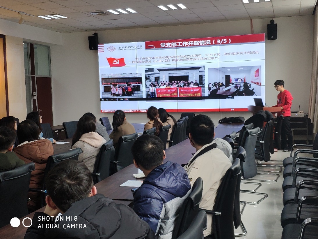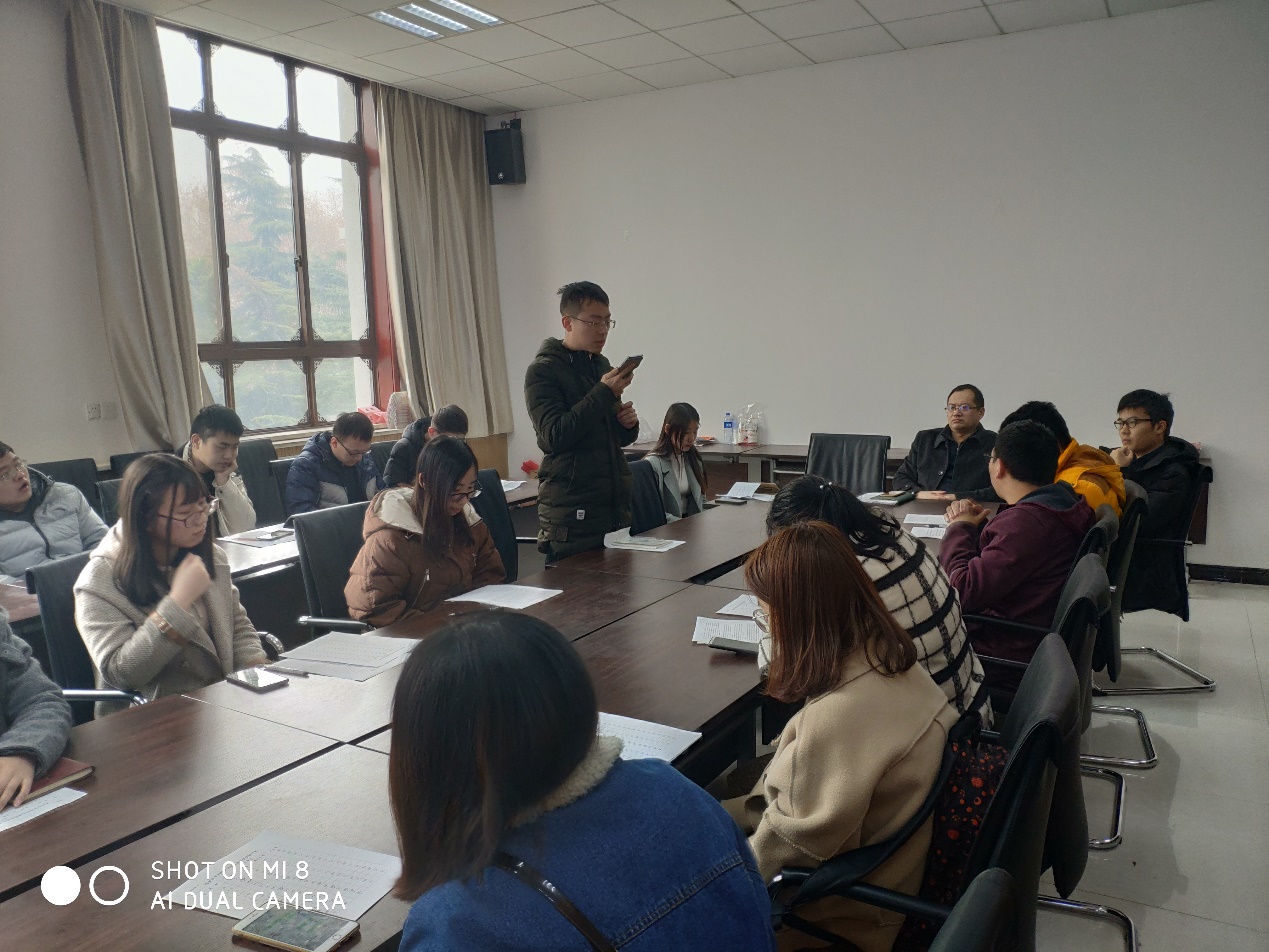 会议第一阶段,支部书记刘汪洋代表硕士031711班第二党支部总结了新支部成立以来开展的一系列活动,活动的主要形式包括:主题党日活动、党支部大会、党支部成员集体学习讨论、支部委员会以及“纪念改革开放40周年”等特色活动。接下来,支部书记刘汪洋代表硕士031711班第二党支部向全体党员大会述职,从基层组织建设、思想政治建设、系列党建活动、党员发展工作四个方面总结了2018年度硕士031711班第二党支部开展的主要工作和取得的成绩。同时,刘汪洋向党员大会汇报了学院党委对该支部2018年度工作的建议和意见,对2019年工作的新的部署和安排,并从“如何紧密联系群众”和“如何更好的发挥高校中基层党支部的战斗堡垒作用”两个角度陈述了过去的不足和今后进一步改进的目标。