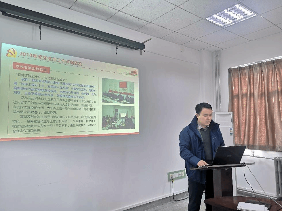 会议第一阶段,支部书记宋胜利代表软件工程系党支部向全体党员大会述职,从基层组织建设、思想政治建设、三会一课学习、主题党日活动、党建与业务工作融合、党员发展与党费收缴等六个方面总结了2018年度软件工程系党支部开展的主要工作和取得的成绩。同时,宋胜利向党员大会汇报谈心谈话活动收集的关于党支部和上级党组织的意见建议,包括党建与业务工作联系不够紧密、党支部建设工作内容不够丰富等问题,进行分析整理,查摆存在的问题和不足,从“三个统一”、“三个强力”和“三个导向”维度提出了改进措施的指导思想、时间点和路线图,以打造标杆支部和一流教师支部为目标,努力做好教育党员、管理党员、监督党员,全力做好组织师生、宣传师生、凝聚师生和服务师生工作。报告结束后,全体党员对党支部工作进行民主评议,肯定了党支部在2018年开展的各项工作以及取得的成果,充分发挥了教师党支部的战斗堡垒作用,也为全院其它教职工支部、本硕博师联合支部、学生支部等树立了榜样。同时,也进一步深入破剖析了存在的问题和产生问题的根源。