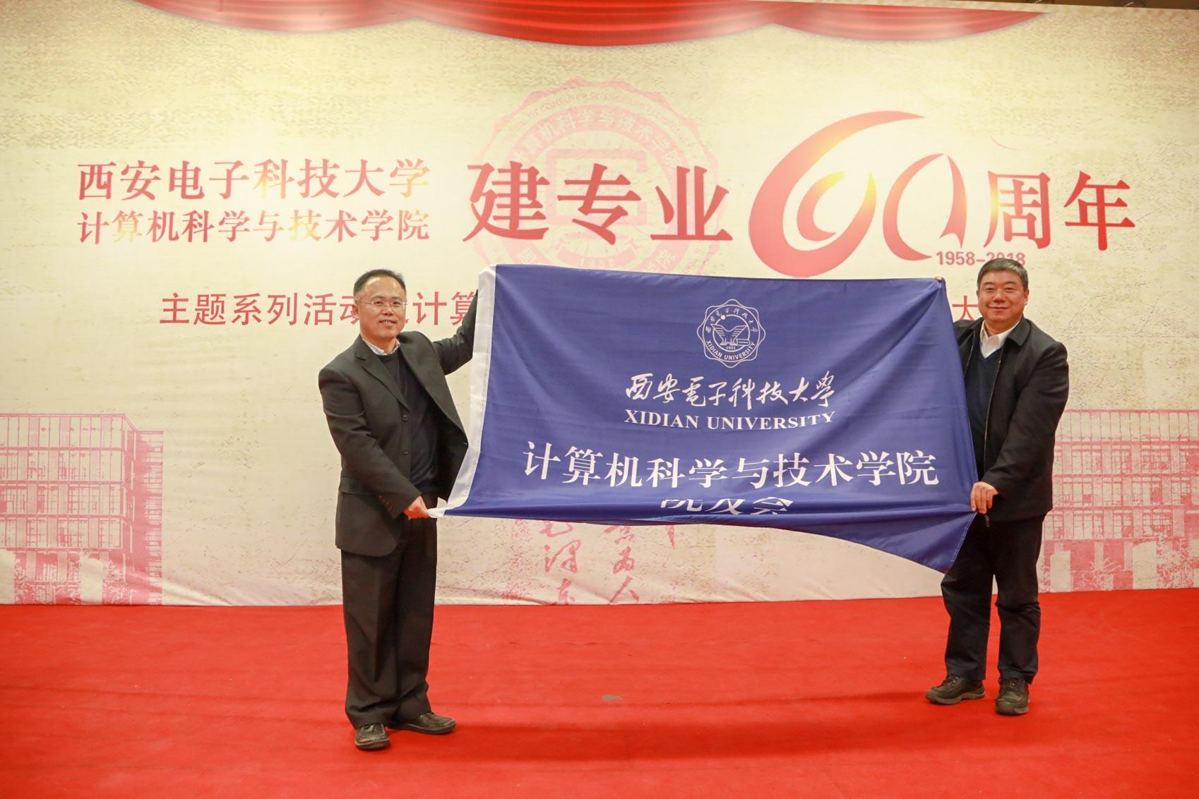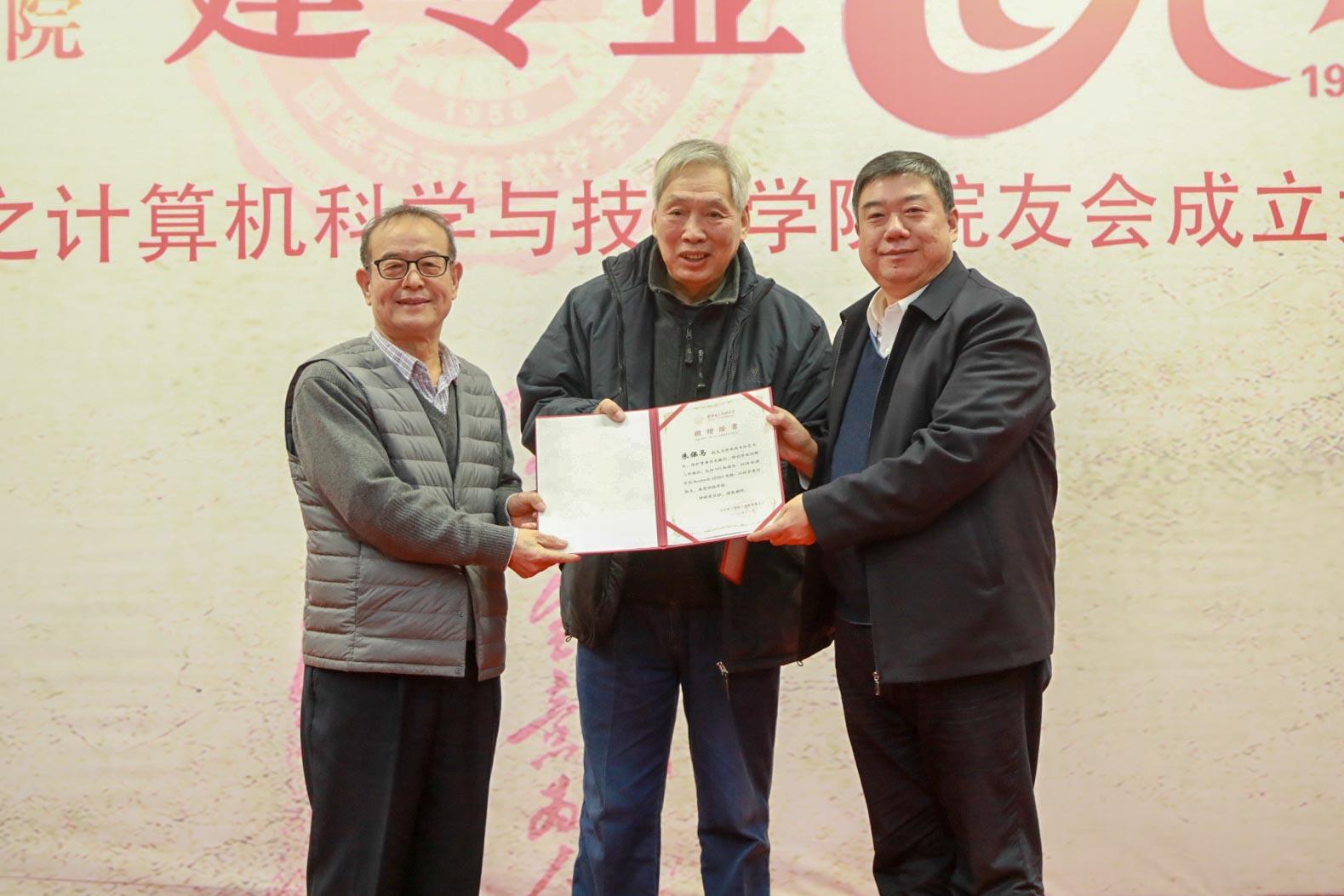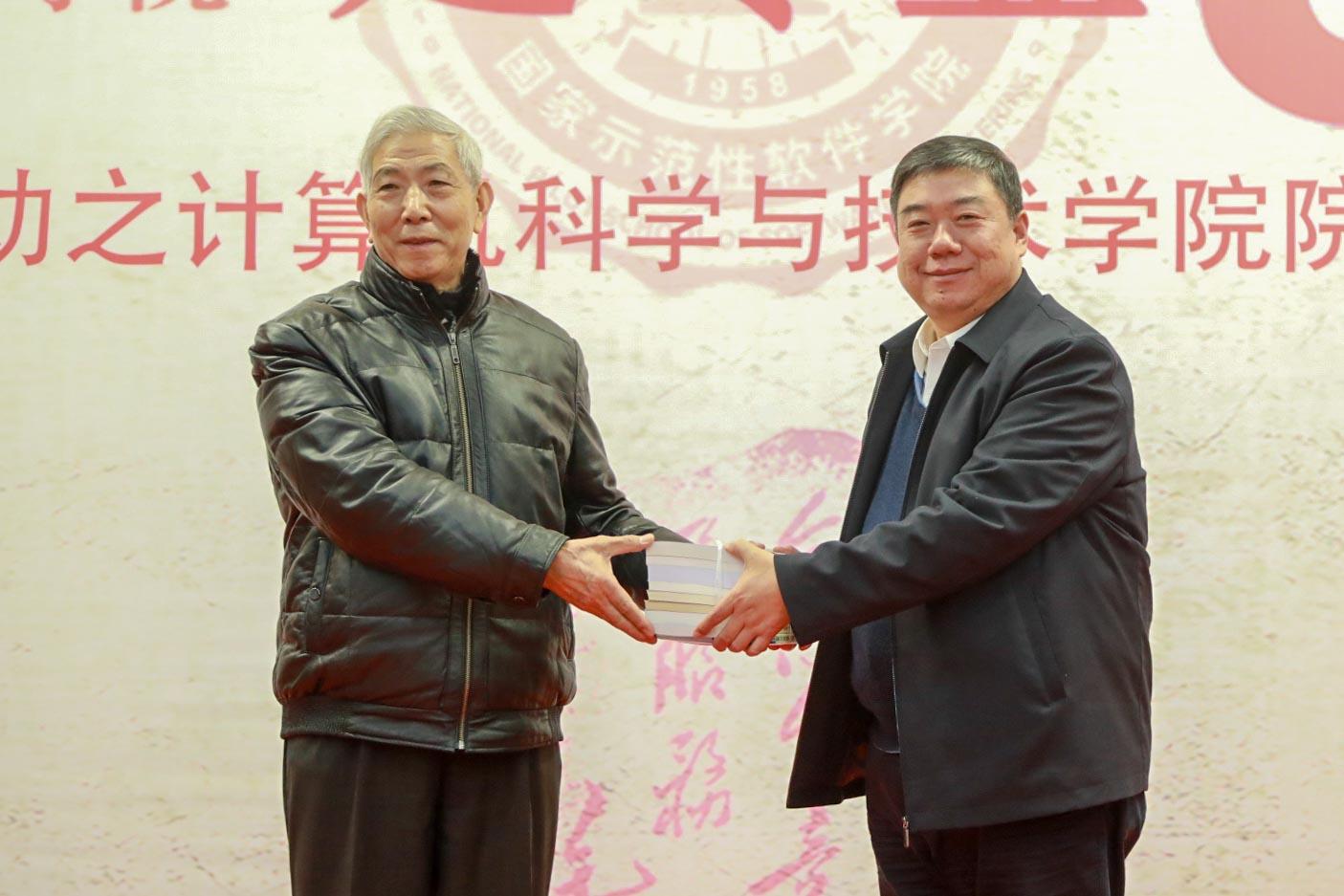 会议还举行了院友捐赠仪式。学院老教师周利华、徐学洲代表1957级校友朱保马向学校捐赠三件物品,包括102机插件、441-B机插件、Rockwell AIM65电脑。据介绍,102机是我国第一台军用数字计算机,1962年上级批准调至我校供教学使用,是当时西北地区唯一一台电子计算机。441-B计算机是我国计算机由电子管向晶体管升级换代的晶体管计算机,我院教师参与生产,1967年交付某海军基地使用,稳定运转近二十年。Rockwell AIM65电脑1978年研发成功,采用美国MOS Technology公司的6502处理器,可使用Pascal,FORTH语言进行编译。周利华老师代表1960级院友、茅盾文学奖获得者凌力向学校捐赠个人作品文集以及珍贵手稿。1959级院友徐宗昌向学校捐赠IETM技术与应用丛书一套、《IETM项目经理入门指南》一册。杨银堂为捐赠人颁发了捐赠证书。