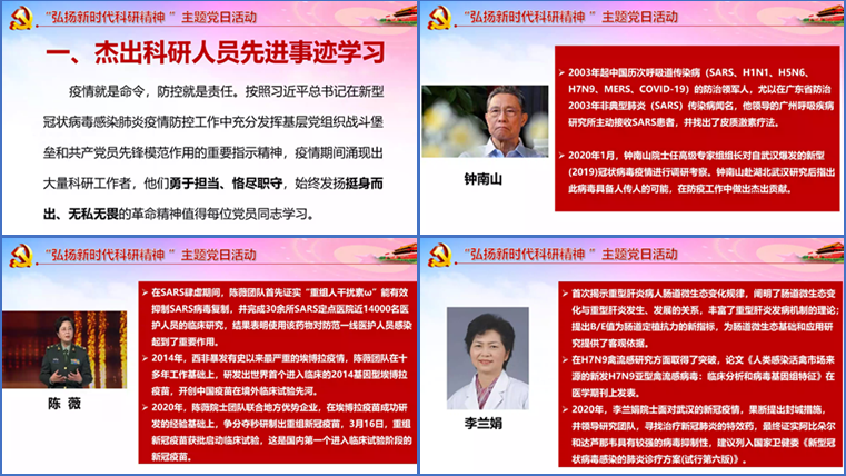 活动开始,王璐老师带领大家学习杰出科研人员先进事迹。王璐老师谈到,疫情就是命令,防控就是责任。按照习近平总书记在新型冠状病毒感染肺炎疫情防控工作中的重要指示精神,支部和党员要充分发挥基层党组织战斗堡垒和共产党员先锋模范作用。疫情期间涌现出了大量科研工作者,他们勇于担当、恪尽职守,发扬挺身而出、无私奉献的革命精神值得每一位党员同志学习。随后,王璐老师带领全体党员对钟南山院士、陈薇院士、李兰娟院士和张定宇院长等杰出科研人员的先进事迹进行了学习,并对习近平总书记在2020年3月2日同有关部门负责同志和专家学者就疫情防控科研攻关工作座谈会时的讲话进行了解读与思想传达。