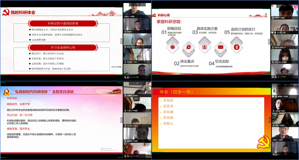 之后,支部研究生党员代表和本科生党员代表分别结合自己的科研工作讨论科研体会与心得。汪丹同志提出在科研工作中,要学习先进科研榜样身上那种埋头苦干、潜心钻研的工作态度,要脚踏实地、持之以恒;吕文琪同志提到做研究最主要的是找到一个正确的科研思路,并分享了个人的科研过程划分经验以及在疫情期间提高工作效率的四象限时间管理法;李尉铭同志提出在家做科研会缺少与同学交流的机会,环境也会影响效率,所以一定要营造一个良好的氛围;鲍珂同志将科研精神总结为三点,第一点就是团结合作、业贵于专,第二点是为山九仞而非一日之功,第三点是荣辱不惊、百尺竿头;曹堉栋同志提出了五点经验:多阅读、多思考、多沟通、多实验和有耐心;范中豪同志提到在研究过程中,耐心和细心是最重要的,一个良好的规划和一个良好的心态也能够让工作更加的顺畅。
