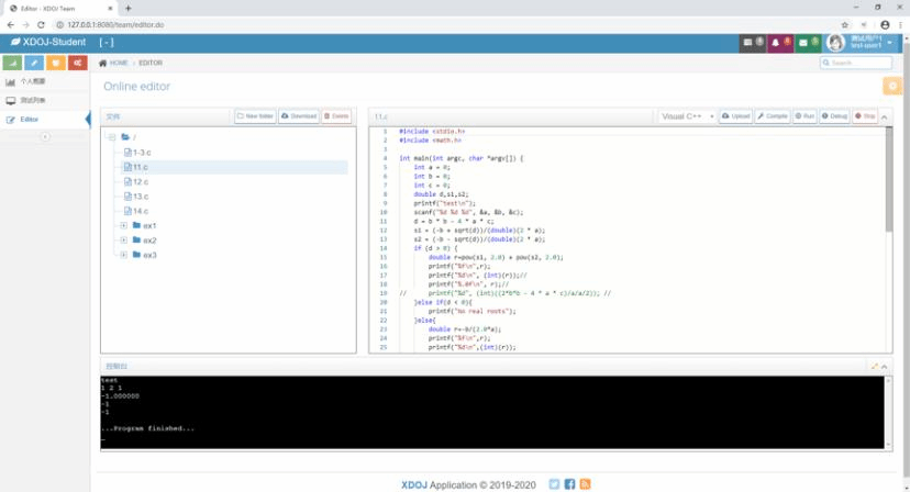 目前主要工作是优化原有功能、新增在线代码编辑器模块,包含在线编辑、编译、运行等功能。由于部分学生电脑没有安装编译软件,此举可以满足学生直接在XDOJ平台上进行编程练习的需求。针对不同机房环境对学生考试有不同的影响,新增的模块将统一编辑环境和编辑工具,未来会在2020级新生中使用。同时引入基于深度神经网络的代码分类功能,更智能地判断学生考试程序的相似度,作为后期成绩复核的依据。