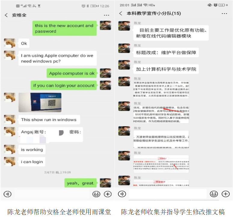 如此大规模的线上教学工作,打得人措手不及。但正因为有这几位可爱的教务老师,计科院的线上教学不但秩序井然,而且涌现出多种多样的典型。首先出场的就是我们的陈龙老师,他积极沟通各位科任教师,为他们答“疑”解“惑”,尽全力消灭一切阻碍线上教学的因素。学院有一门外教课程“软件过程与项目管理”,疫情发生时任课教师安老师在印度,陈龙老师迅速与安老师取得联系,带他提前熟悉各类在线学习平台。当得知“学在西电”不能在国外登陆后,又第一时间远程帮助安格全老师安装并测试雨课堂,保证安老师在线教学的顺利进行。他还按照学院总体部署,做好2016级本科生毕业设计中期检查和学籍等各类工作;并主动加入本科教学宣传小组,竭尽所能地贡献自己的聪明才智。