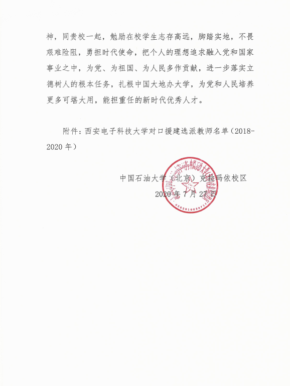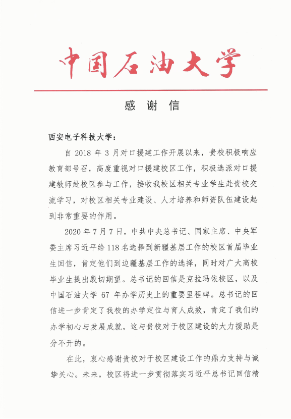 (通讯员 陈龙)为响应教育部号召,对口援建中国石油大学(北京)克拉玛依分校,2018年9月,best365手机版官方网站选派教学科研经验丰富的牛海军教授前往中国石油大学(北京)克拉玛依分校援建三年,牛海军教授勇于担当、甘于奉献,在援建期间,工作兢兢业业、任劳任怨、无私奉献,开展了大量卓有成效的工作,得到了学校领导、同事和学生们的认可。中国石油大学(北京)克拉玛依分校为表达感谢,专门致电学校,对我校及牛海军教授表示感谢。