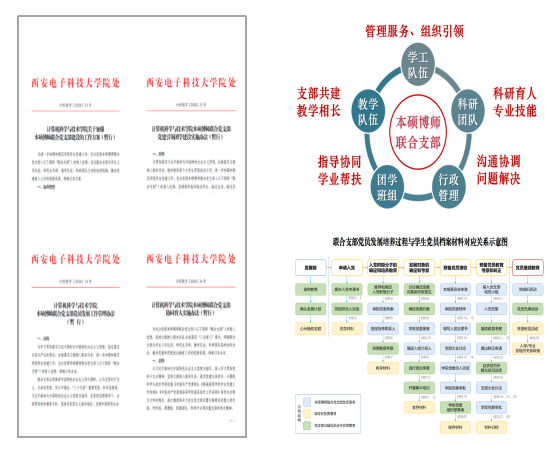 依托本硕博师联合党支部,培育有传承的支部文化。计科院党委以本硕博师联合党支部为抓手,根据8个研究所专业特点和科研资源,发挥教师和高年级博硕士生对低年级学生的传帮带作用。组织开展“传承—初心与使命”主题党日、优秀党员先锋进新生宿舍、“学习优秀科研榜样,建设科技创新型国家”主题党日等。打造共性主题突出、个性特色彰显的可传承支部文化,其中智能软件与系统新技术研究所本硕博师联合党支部围绕智能软件发展新需求与智能系统变革新趋势,形成了“‘传承’科研精神、‘发扬’拼搏作风”的支部文化;嵌入式计算技术研究所本硕博师第一联合党支部紧密结合国家自主可控发展战略,形成了“务实创新、勇于奉献”的支部文化;计算机网络与物联网工程研究所本硕博师联合党支部立足学科发展前沿,面向网络空间安全、物联网、区块链等国家重大战略,形成了“求真务实、自主创新”的支部文化。发挥联合支部书记为教师党员的作用,促进教师支部与联合支部协同共建,开展疫情背景下师生支部共度国庆中秋节等专题座谈,发挥教师对学生的思想引领、专业指导和就业引导作用,以学生的所思所想和实际需求帮助教师不断改进人才培养质量。鼓励联合支部间互助联动,开展“学长学姐经验交流”主题党日、“安全先锋沙龙”系列活动等,扩大活动吸引力和覆盖面。以本硕博师联合党支部为抓手,推进校企合作。联合支部走进华为等用人单位开展“爱国强国报国,建功立业新时代”主题党日,对接中电科西北集团西安分公司党支部、航天科工四院十七所党支部等开展支部结对共建,对接用人单位需求,共享党建工作经验。实施本硕博师联合党支部“党建引领就业”行动计划,现已举办两期活动,以党建引领推动人才培养和就业质量提升。