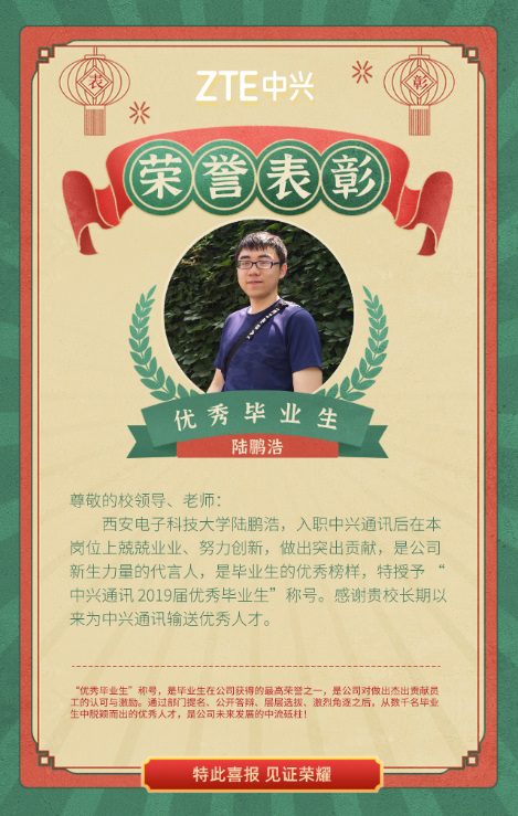 (通讯员 同榛)近日,学院收到中兴通讯股份有限公司人力资源部发来的喜报:在刚刚结束的中兴通讯2019届优秀毕业生评选中,best365手机版官方网站2019届软件工程专业硕士毕业生陆鹏浩荣获中兴通讯2019届优秀毕业生称号。