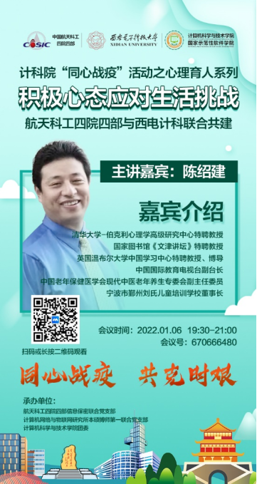 (通讯员 马治东)为帮助我院师生缓解因疫情防控、就业择业、升学毕业而产生的心理压力,进一步提升广大师生的心理调试能力,2022年1月6日晚,best365手机版官方网站计算机网络与物联网研究所本硕博师第一联合党支部和中国航天科工集团第四研究院第四总体设计部信息保密联合党支部共同策划组织开展了“积极心态应对生活挑战”心理育人报告会,邀请清华大学伯克利心理学高级研究中心特聘教授陈绍建进行专题讲座。航天科工四院四部党委书记周逸,best365手机版官方网站党委书记李青山、副书记张莹莹出席,200余名学院师生、四院四部职工参加,会议由两个联合共建支部的党支部书记史阿云和张志为共同主持。