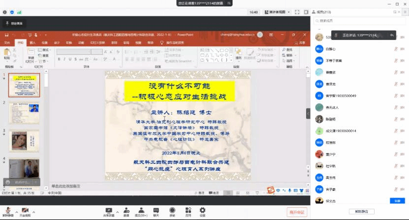 随后,陈绍建教授以“没有什么不可能——积极心态应对生活挑战”为题进行了讲座。他通过“费斯汀格法则”展示了错误认知如何带来严重的后果,进而提出了以积极心态和从更高视角看问题的方法。他启发大家思考,在西安正在经历疫情的事实情况下,应该如何调整心态应对各种非预期的不确定性。他强调,“人在山能成‘仙’,人在谷不脱‘俗’”,只要有改变抱怨的态度,积极地去做当下应该做的事情,那么就一定能突破困难,改变生活。
