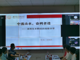 毕业生代表纷纷发言,苑永哲以“我的研究生科研简记”为主题,从科研起点谈到科研体会及科研方法,为同学们提供了宝贵思路,苑永哲说:“科研是有趣的也是枯燥的,从进入领域到深入领域的过程是积累的过程,需要耐心学习,厚积薄发”。刘奕伯以“中流击水,奋楫者进”为主题分享了求职经历,把每次考试当作是唯一机会去把握,“百舸争流,奋楫者先;中流击水,勇进者胜”。高向阳从联系导师、科研项目、信息搜集、网上填报等四个方面为同学们提供了保研经验。邸维高以“行而不辍,未来可期”为主题,从求职目标、撰写简历、提升能力、面试准备等四个方面分享了求职经验。