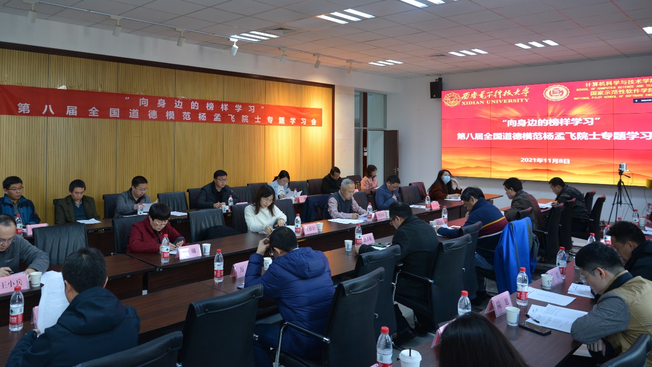 为发挥模范榜样示范引领作用,为奋斗新时代、奋进新征程立根铸魂、凝心聚力,11月8日下午,计科院召开“向身边的榜样学习”——第八届全国道德模范杨孟飞院士专题学习会。学院党政领导班子、两位委员、系及实践中心负责人、各所领导、教师党支部书记和本硕博师联合党支部书记等30余人参加,校党委教师工作部副部长王蓓金到会指导。会议由学院党委书记李青山教授主持。