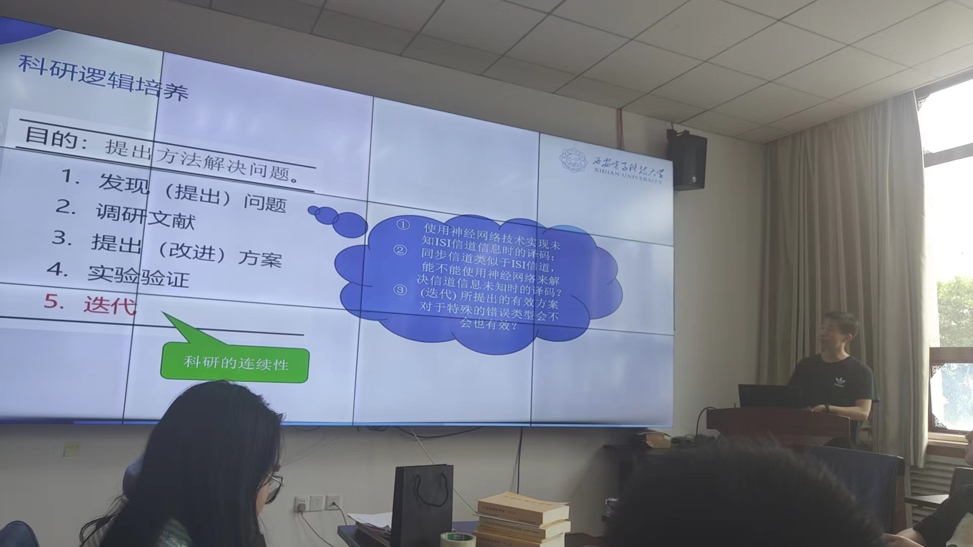 本科毕业生党员许珈铭以“我的这四年——不忘初心,砥砺前行”为主题,结合自己的经验分享了他参加科研和比赛的心得和收获,包括如何选择比赛项目、如何进行团队合作以及如何提高比赛水平等。许珈铭深入讲述了自己在大学期间参与科研和比赛的故事,分享了自己的收获和成长。